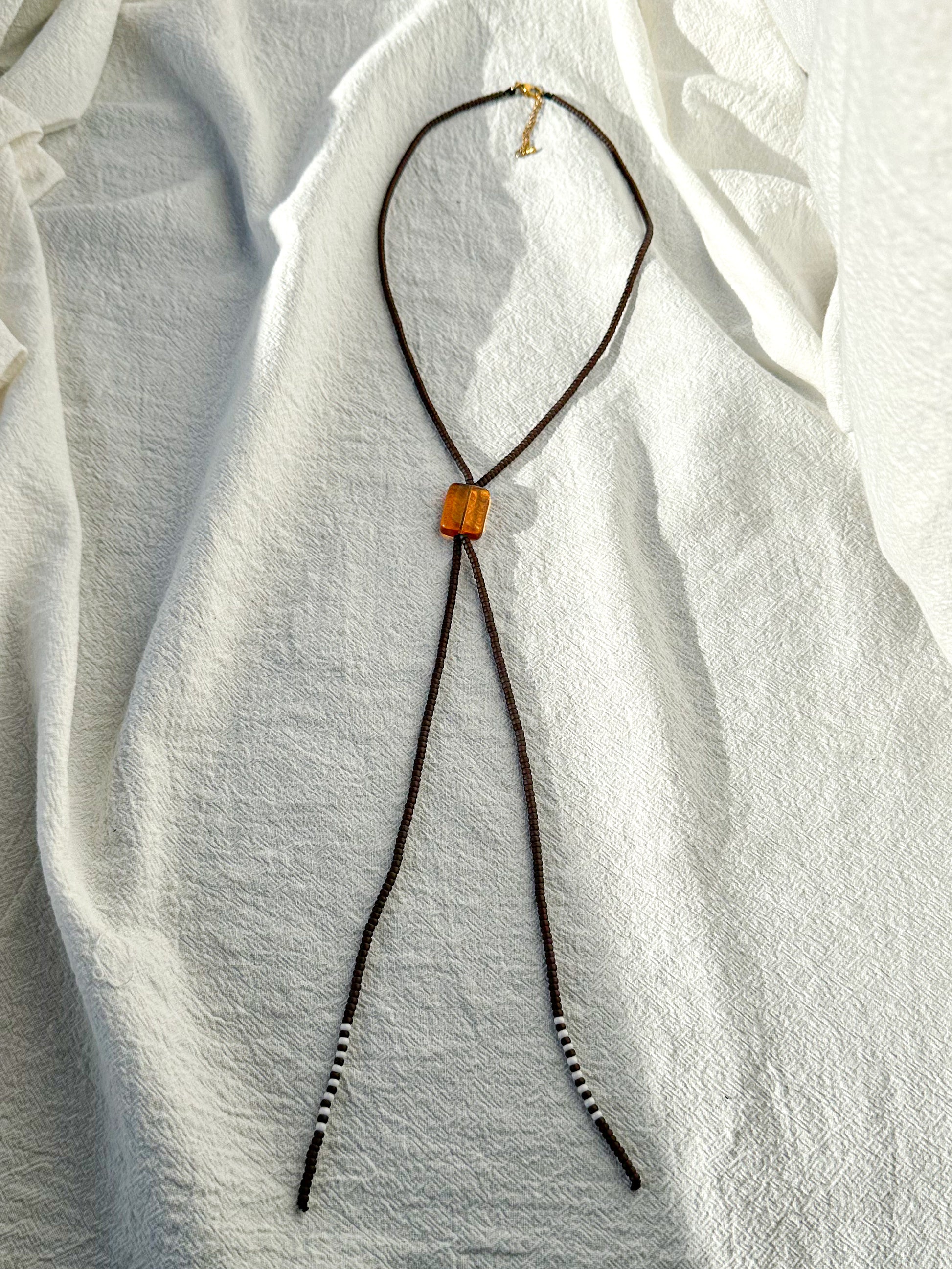 Beaded necklace to look like a bolo, bead does not slide but the length is adjustable in the back with a little chain extender!