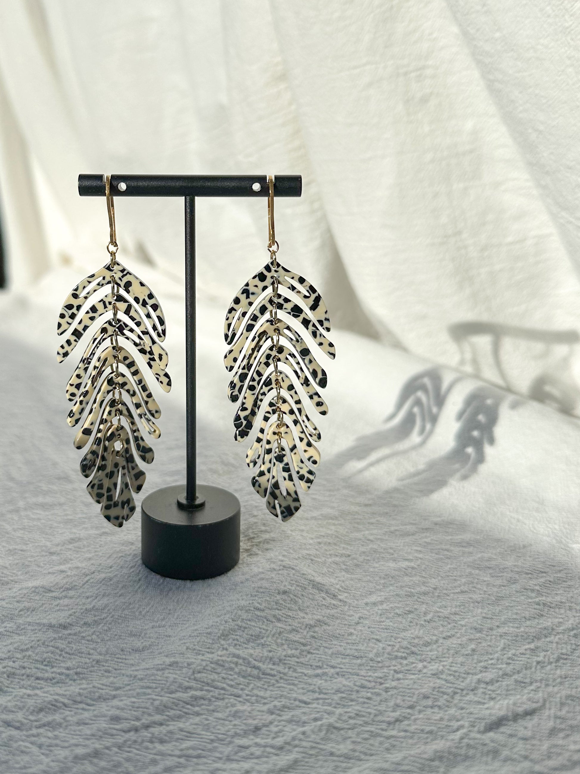 Acrylic feathered dangly earrings, lightweight and very popular!