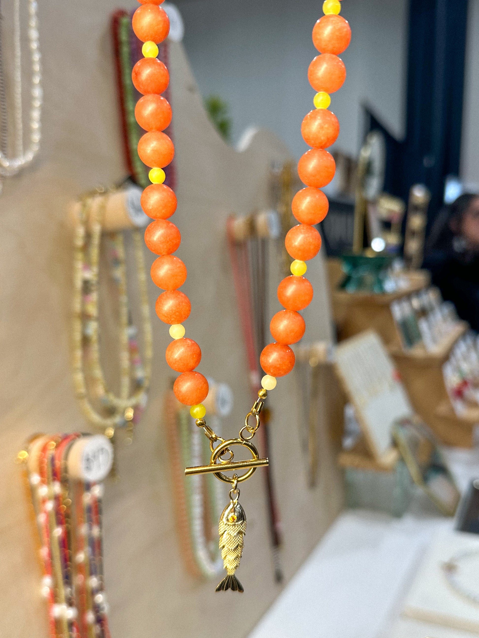 Olive jade beads, freshwater pearls, and a golf filled charm